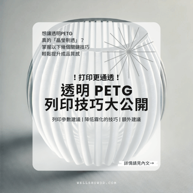 30 10 月 部落格 打印更通透!透明 PETG 列印技巧大公開 2025年 10月 30日 By system 想讓透明PETG真的「晶瑩剔透」?掌握以下幾個關鍵技巧,輕鬆提升成品質感讓你的透明PETG不再只是「霧面」,而是真正的「透明感」! 列印參數建議 增加列印溫度:溫度略高240–250°C(建議依機器與環境微調) 降低列印速度:建議慢速...繼續閱讀