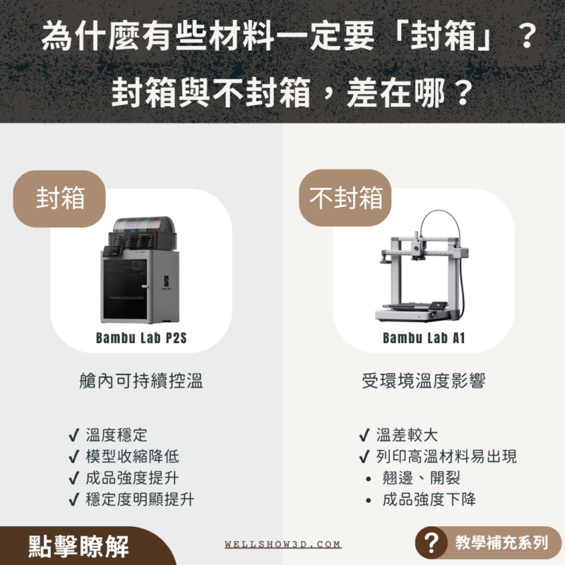 27 3 月 部落格 為什麼有些材料一定要「封箱」?封箱與不封箱,差在哪? 2026年 3月 27日 By system 在 3D 列印中,很多人都遇過:邊角翹曲、層黏性不足、模型開裂、成品強度不佳你可能以為是材料或參數問題,但其實很大的原因來自——「環境溫度不穩定」 為什麼 ABS / ASA / PC 等 工程材料 皆需要封箱? 因為 ABS、ASA、...繼續閱讀